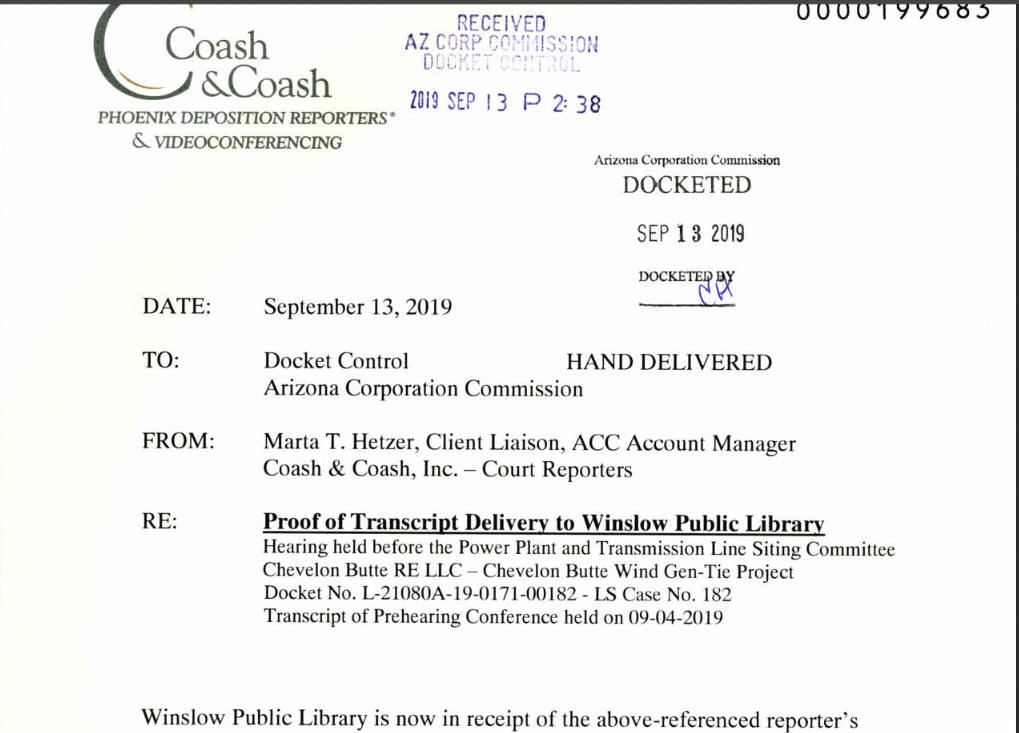 Public comment submitted to AZCC.gov on 9/15/2019 regarding Chevelon Butte RE LLC wind farm proposal and public notice of hearing as presented to Winslow Public Library