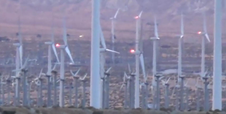 This is how night time skies look at wind farms 4 miles away, bright red flashing all night long a view in Desert Hot Springs at night in motion I filmed this myself video of what these things do to the